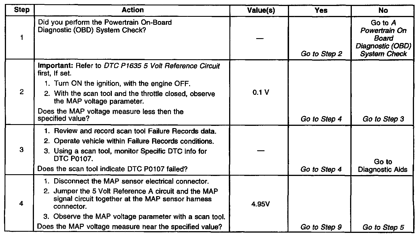 Also to update the Barometric Pressure Reading (BARO), as an enabling factor for other diagnostics. The PCM monitors the map signals for voltages outside the normal range of the MAP sensor. If the PCM detects a MAP sensor signal voltage that is excessively low, DTC P0107 will set. P0401