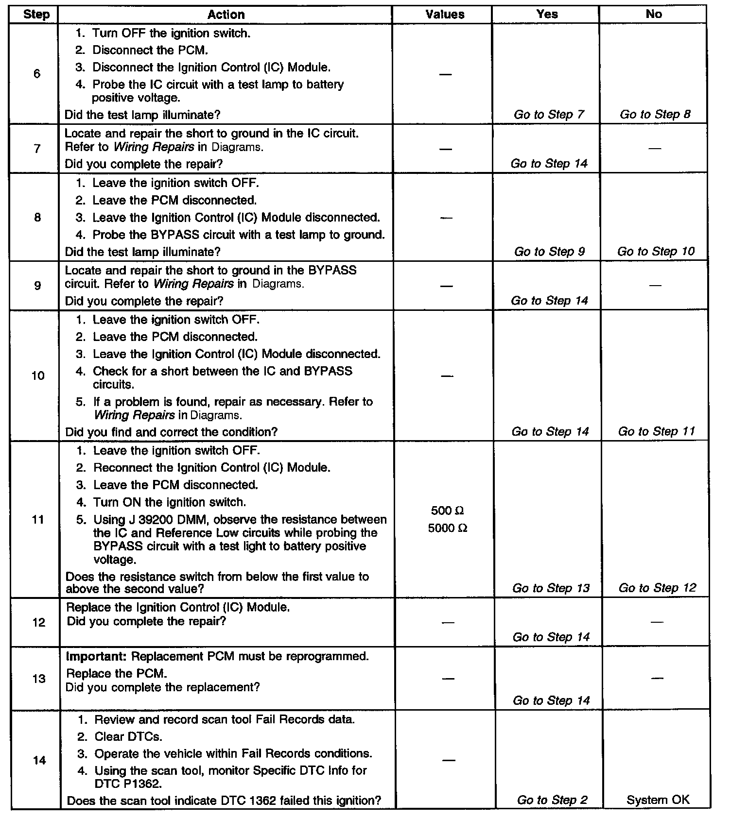 The Ignition Control (IC) Module sends signals that the PCM requires for fuel control and spark advance calculations. At the start of engine crank, the IC Module controls spark advance. When the second 3X reference pulse is recognized by the PCM, the PCM applies 5.0 volts to the Bypass circuit, commanding the IC Module to switch spark advance to PCM control. If the PCM detects a short to voltage in the Bypass circuit, DTC P1362 will set. A short to ground in the IC circuit or Bypass circuit will cause both DTC P1352 and DTC P1362 to set. The engine will start and may run with ICM controlling spark timing.