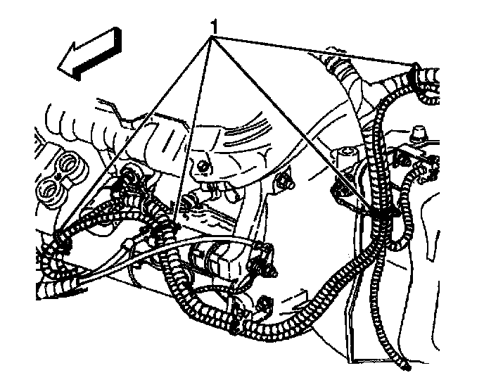 3. Use three new tie straps (1) in order to secure the coolant heater cord to the engine lower wiring harness.