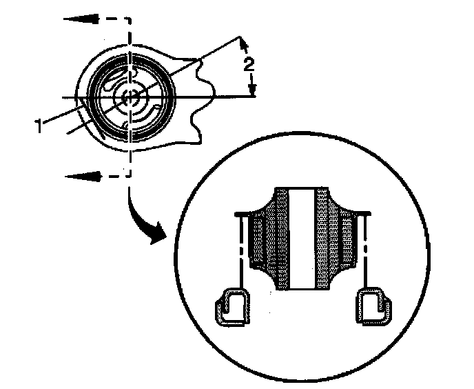 1. Align the flat edge of the bushing flange to the mark in the control arm (1). Ensure that the flat edge of the bushing flange is 30 degrees (2) from the centerline of the lower control arm. Ensure that the thin slot in the bushing is facing outboard.