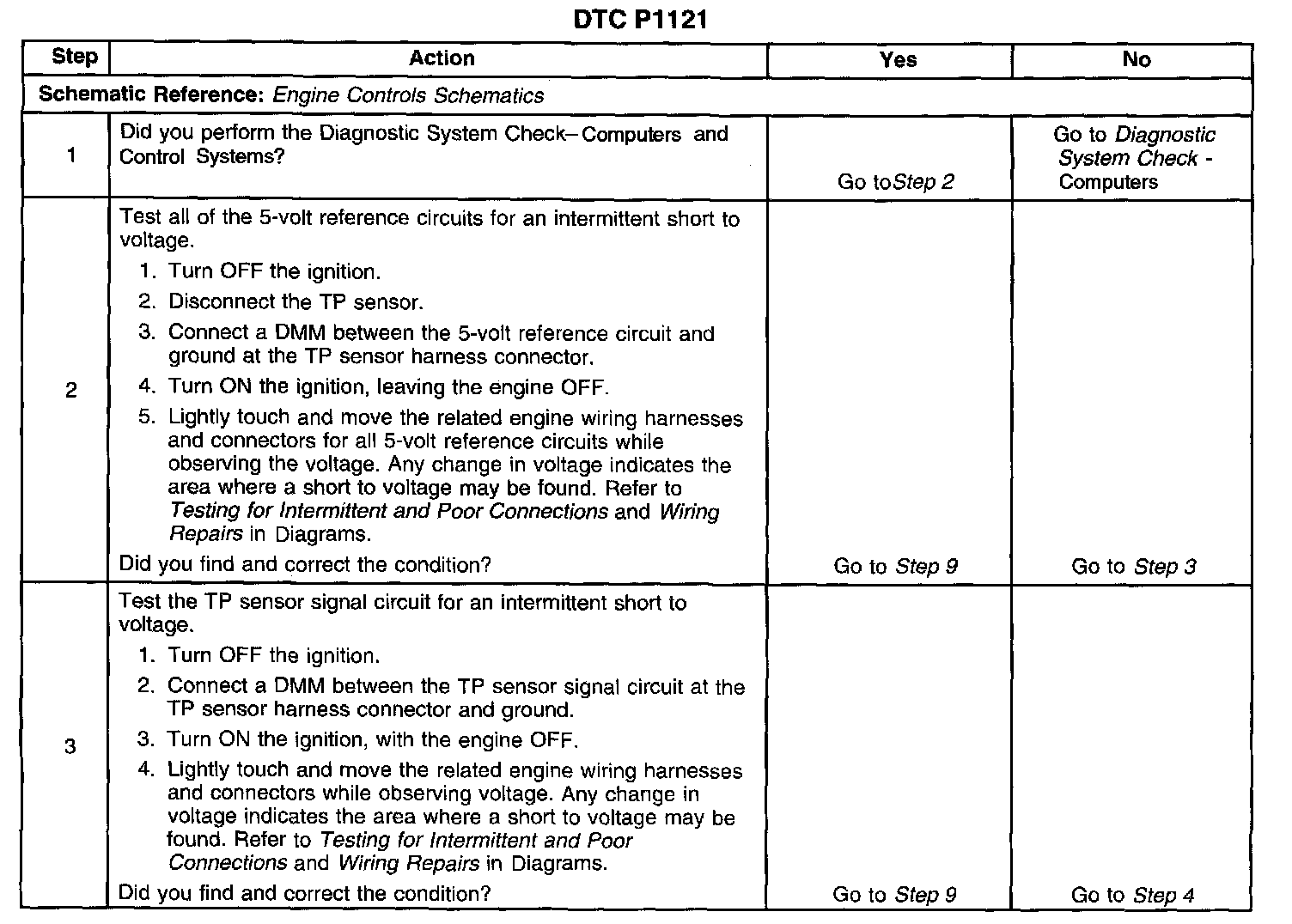 Rotation of the TP sensor rotor from the closed throttle position to the Wide Open Throttle (WOT) position provides the PCM with a signal voltage from less than 1.0 volt to more than 4 volts through the signal circuit. If the PCM detects an intermittent and excessively high signal voltage, This DTC will set.