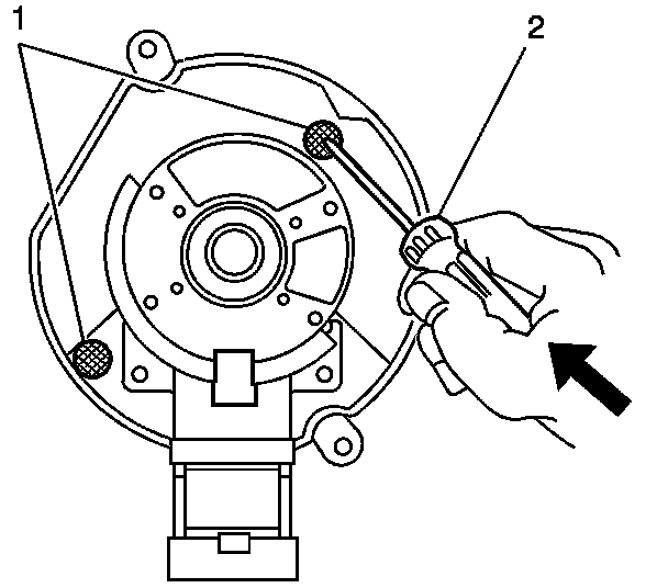 4. Inspect the distributor vent screens (1). If the vent screens are present, remove them by using a plastic-handled, long blade awl or pick (2). Insert into the airflow vent screens and pop them out. Refer to the figure for removal procedure. If the vent screens have been removed from the base of the distributor, then check the airflow inlets for being clogged with debris.