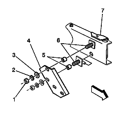 5. Remove the rear bracket retainers (1), and remove the bracket (8) from the vehicle.