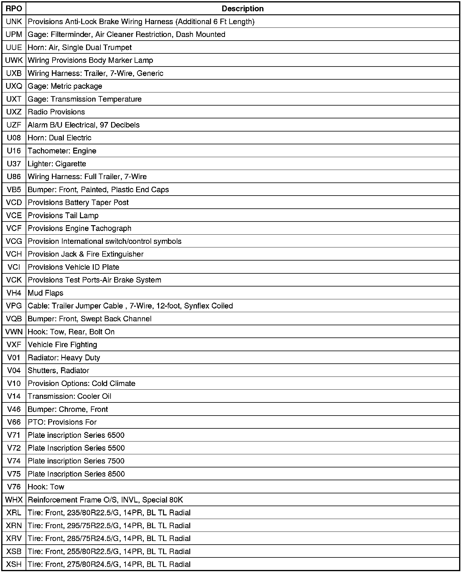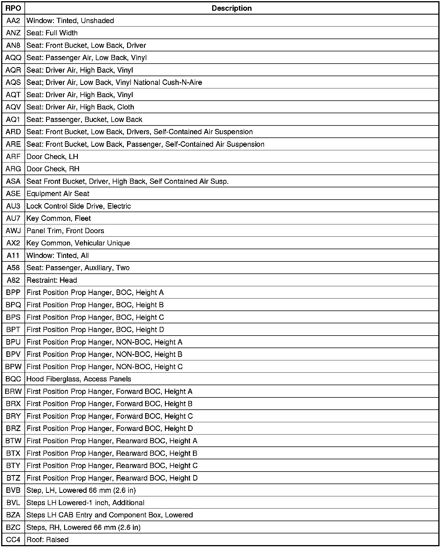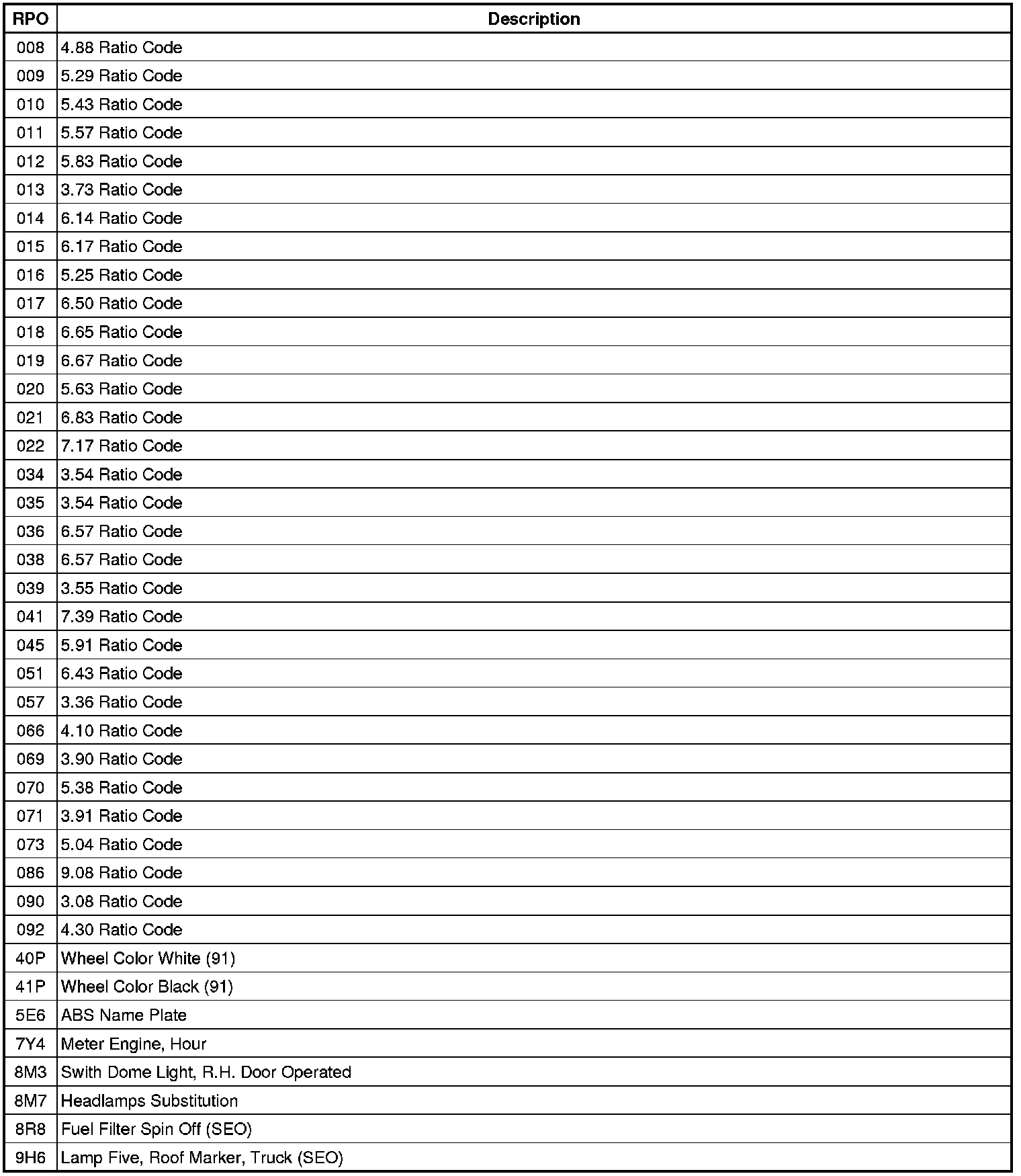 RPO Code List