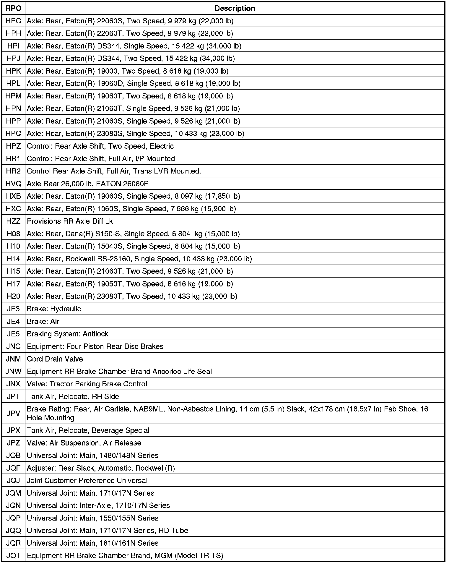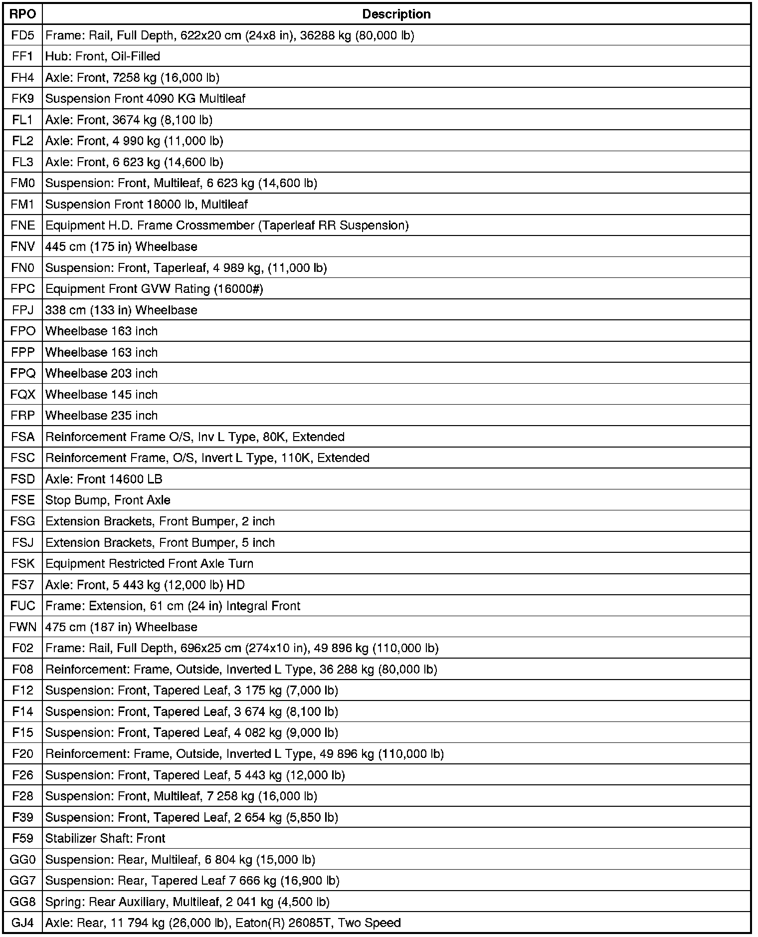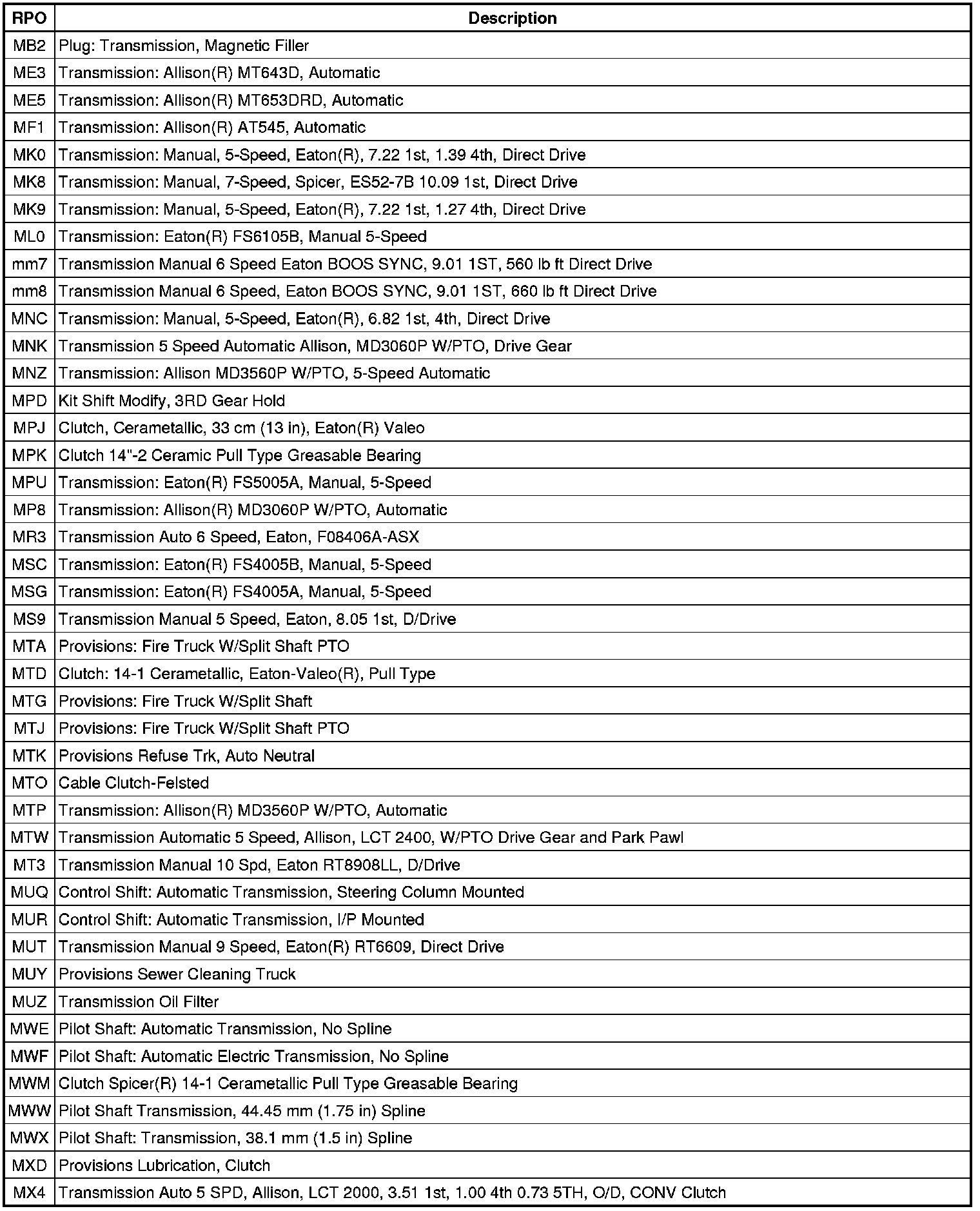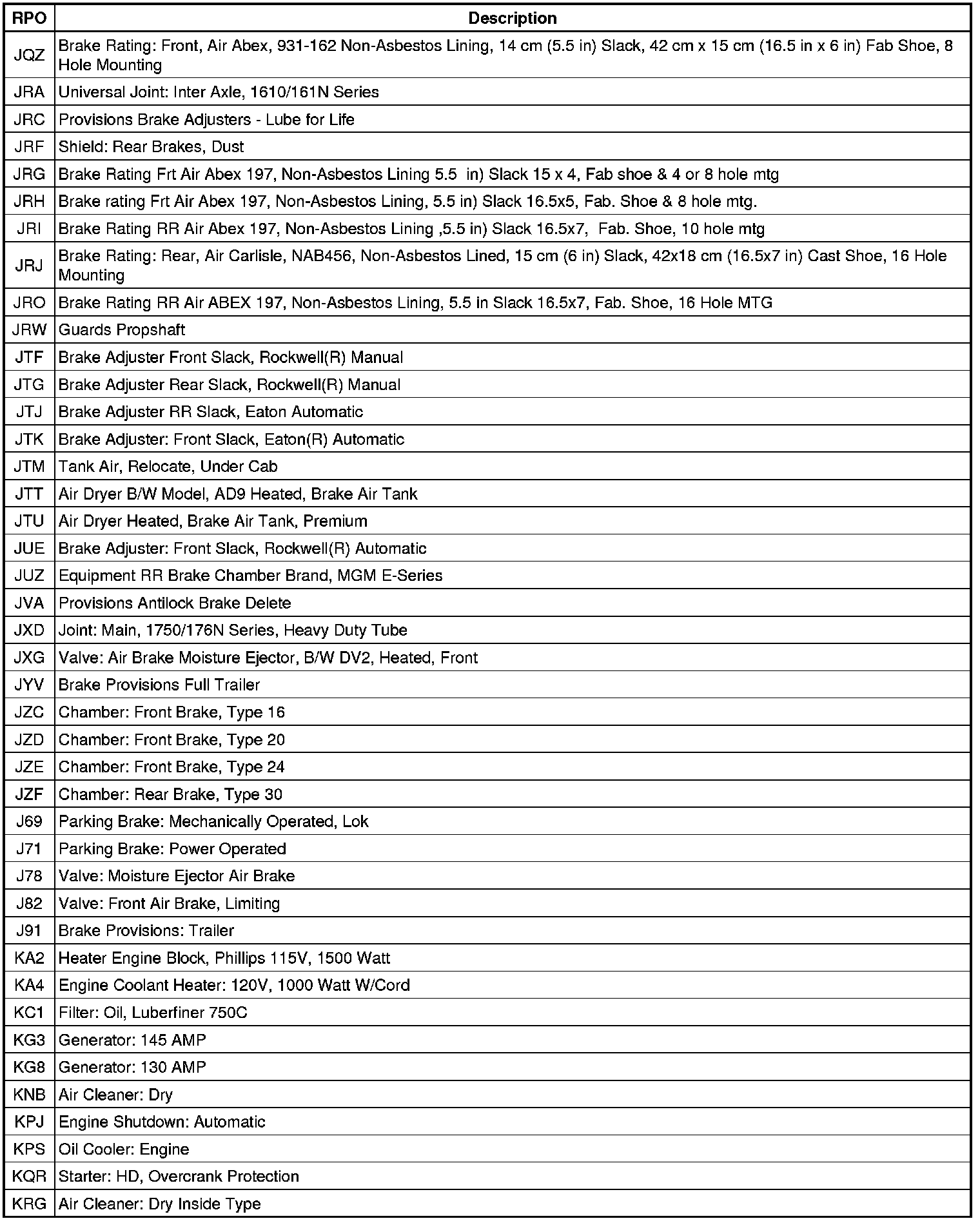 RPO Code List