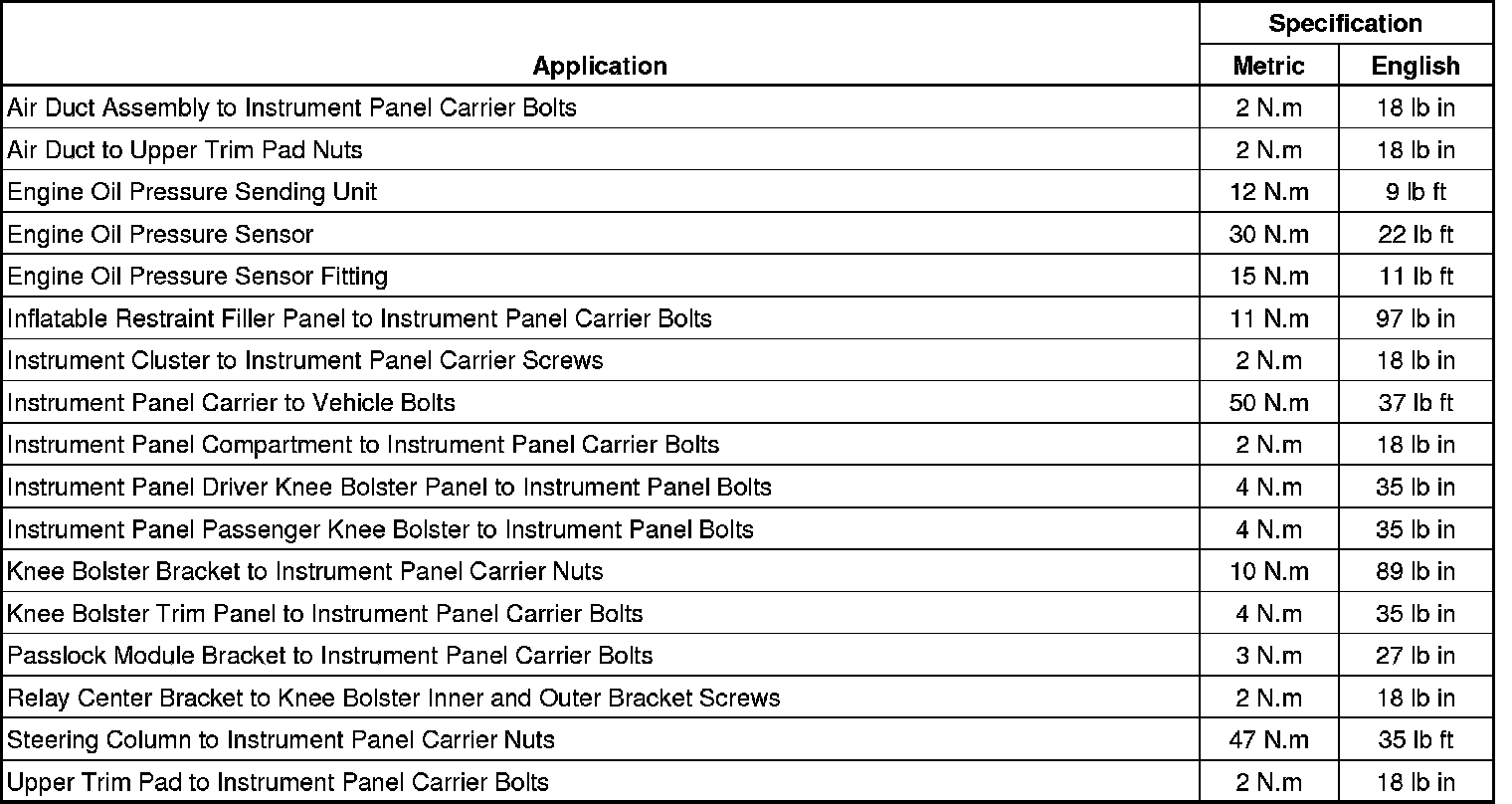Instrument Panel, Gages and Console - Fastener Tightening Specifications
