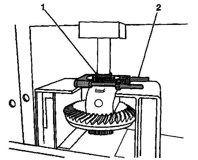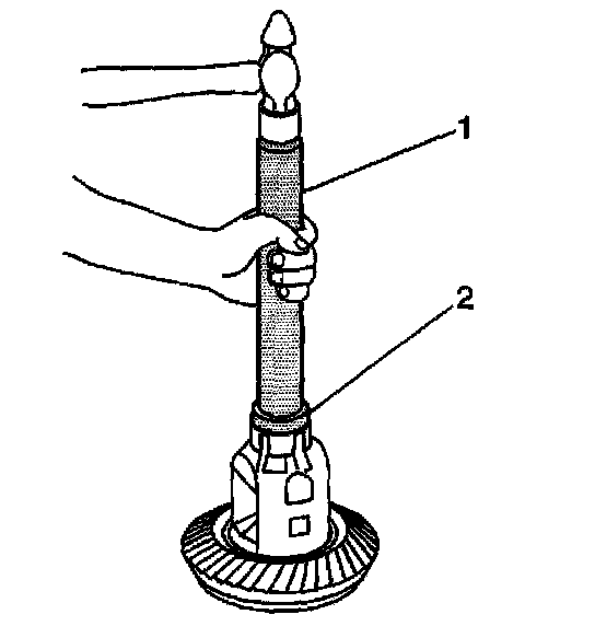 1.2. Install the J25299 (8.6 inch axle) (1), or the J29710 (9.5 inch axle) (1) and the J 8092 (2) onto the differential case bearing as shown.