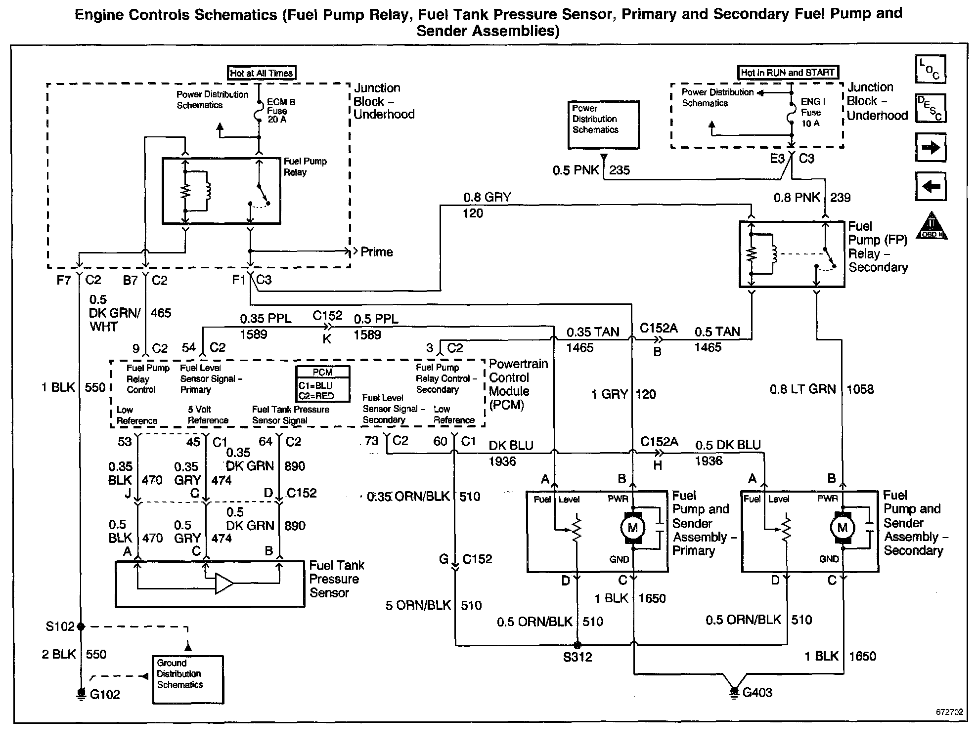 Engine Controls Schematics: Fuel Pump Relay, Fuel Tank Pressure Sensor, Primary And Secondary Fuel Pump And Sender Assemblies: