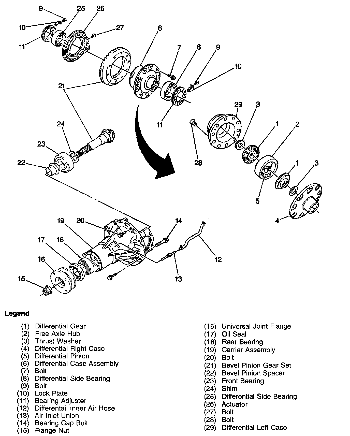 The differential assembly utilizes a hypoid beveled ring and pinion gear set. It consists of a ring gear which is mounted to the differential case, a pinion gear which is mounted in the differential carrier, and a set of four gears mounted inside the differential case. Two of these gears are known as side gears and the other two are known as differential pinion gears. The right side gear is splined to the right drive axle shaft, and the left side gear is splined to the left inner axle shaft.