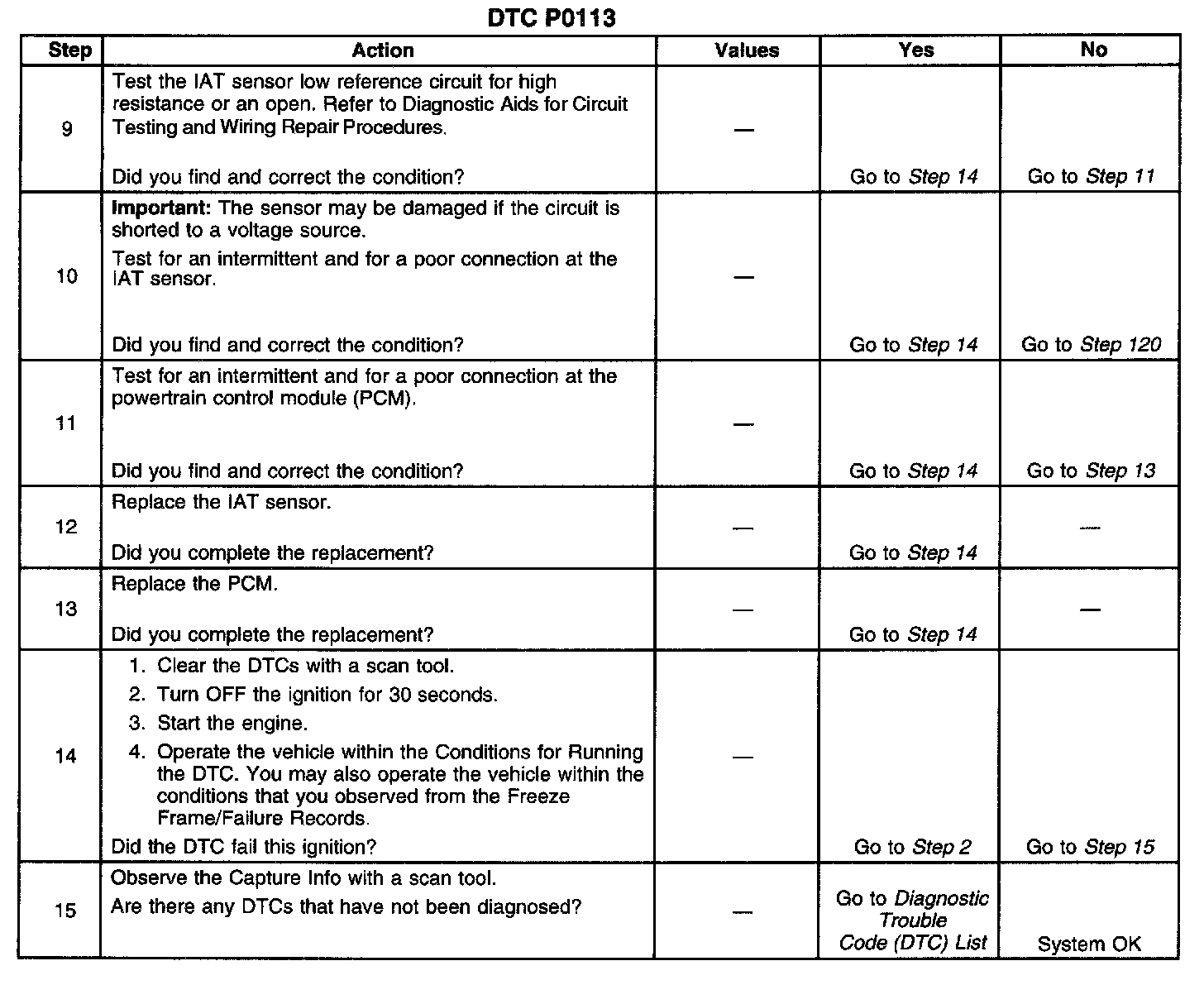 CIRCUIT DESCRIPTIONThe intake air temperature (IAT) sensor is a variable resistor, sometimes called a thermistor. The IAT sensor has a signal circuit and a low reference circuit. The IAT sensor measures the temperature of the air entering the engine. The powertrain control module (PCM) supplies 5 volts to the IAT signal circuit. When the IAT sensor is cold, the sensor resistance is high. When the air temperature increases, the sensor resistance lowers. With high sensor resistance, the PCM detects a high voltage on the IAT signal circuit. With lower sensor resistance, the PCM detects a lower voltage on the IAT signal circuit. If the PCM detects an excessively high IAT signal voltage, indicating a low temperature, DTC P0113 sets.