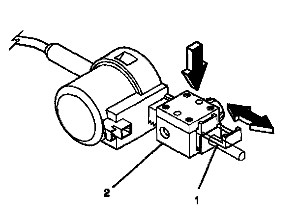 3.1. Pull out the tab (1) on the adjuster block side (2) of the automatic transmission shift lock control actuator.