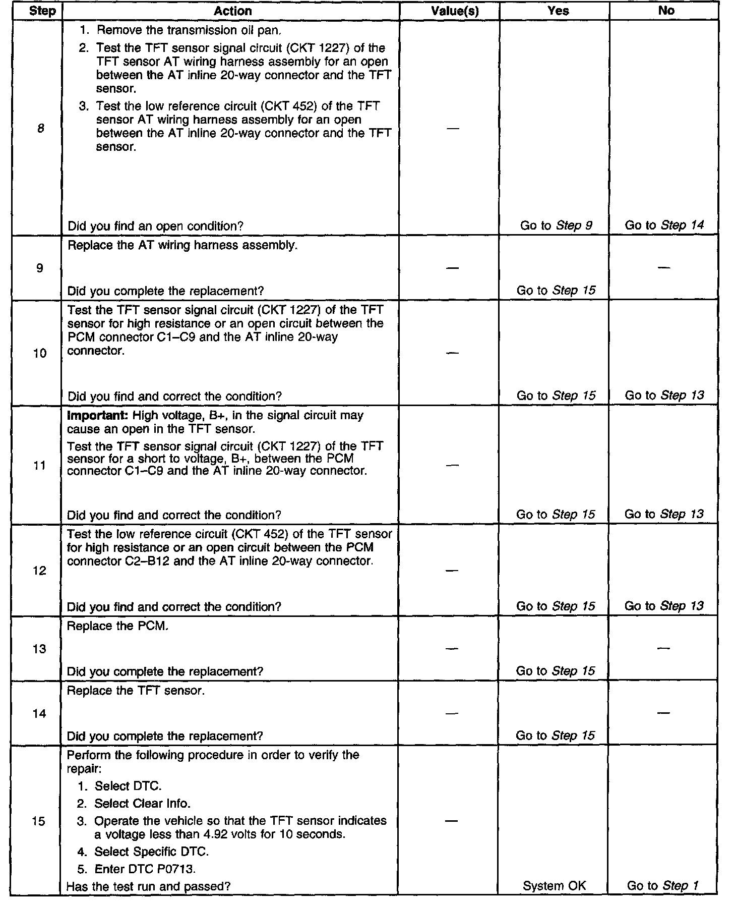 8. This step inspects the TFT sensor and the AT wiring harness assembly for an open.