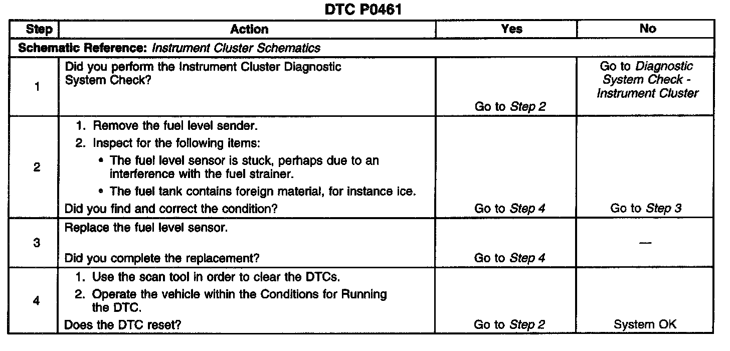 This diagnostic table tests for a stuck fuel level sensor. The PCM sets this DTC if the fuel level sensor appears to be stuck, based on a lack of fuel level sensor signal variation expected during normal operation.
