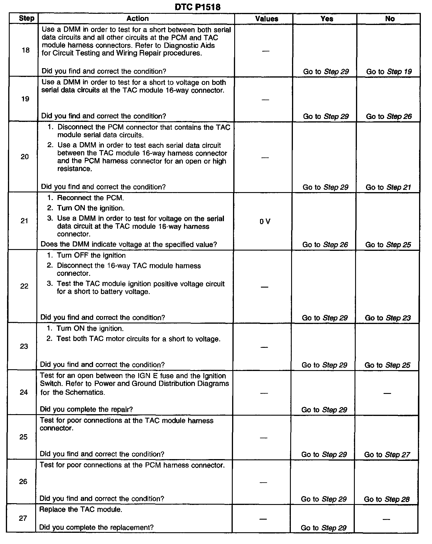 ^ DTC P1518 sets if the TAC module ignition feed circuit is shorted to a B+ supply circuit. The TAC module stays powered-up when the ignition is turned OFF. When the ignition is turned ON, the TAC module is powered-up before the PCM. DTC P1518 sets because no communication is detected by the TAC module from the PCM. Inspect related circuits for being shorted to a B+ supply circuit.