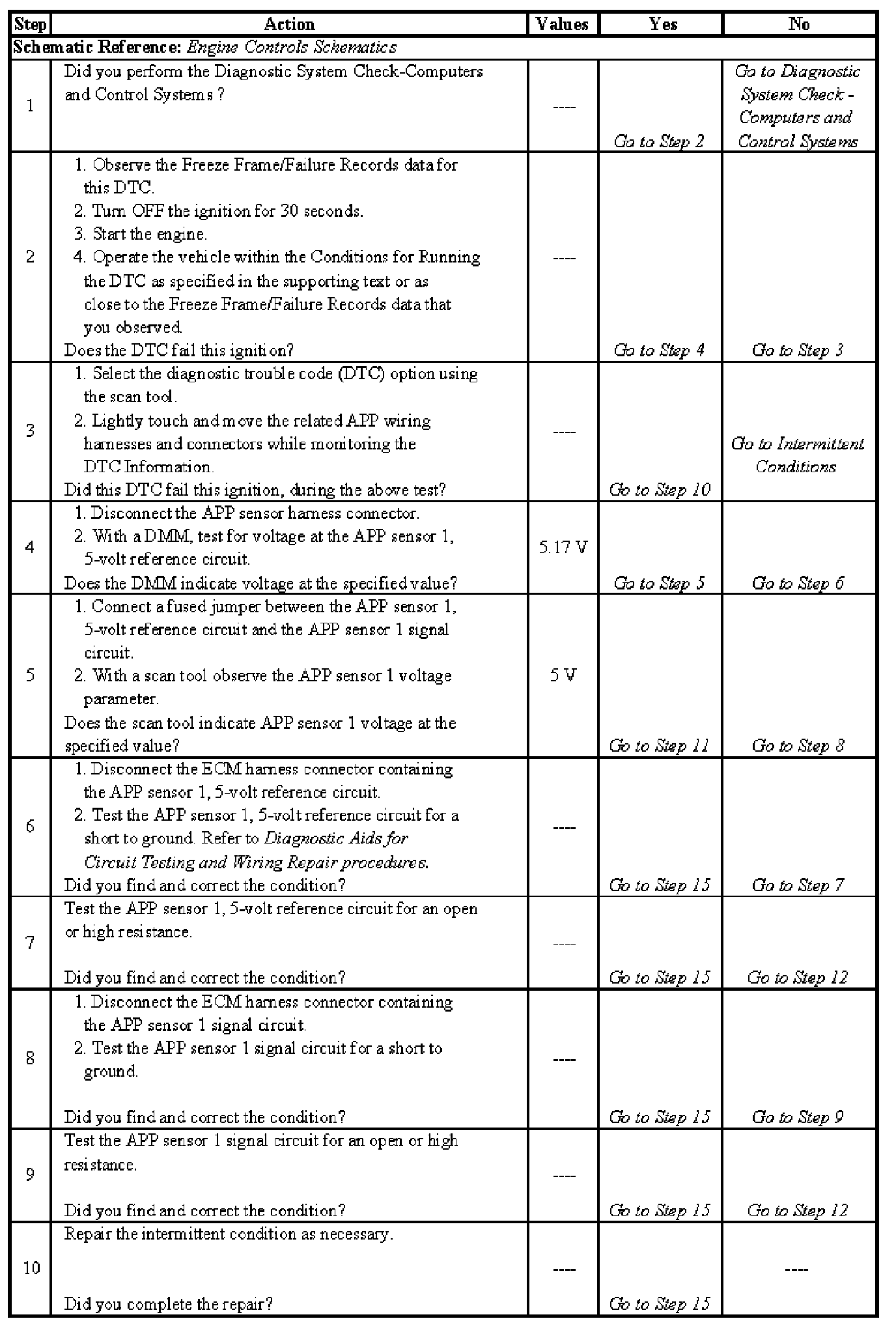 The accelerator pedal position (APP) sensor is mounted on the accelerator pedal control assembly. The sensor is made up of 3 individual sensors within 1 housing. Three separate signal, low reference, and 5-volt reference circuits are used in order to interface the APP sensor with the engine control module (ECM). Each sensor has a unique functionality to determine pedal position as shown in the table below. The ECM uses the APP sensor to determine the amount of acceleration or deceleration desired by the person driving the vehicle via fuel injector control. This DTC sets if the ECM determines an out of range condition with the APP sensor.