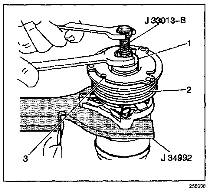 6. While holding the body of J 33013-B of the remover with a wrench, turn the center screw into the remover body in order to remove the clutch plate and hub assembly (1).