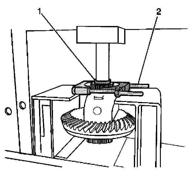 1.2. Install the J25299 (8.6 inch axle) (1), or the J29710 (9.5 inch axle) (1) and the J8092 (2) onto the differential case bearing as shown.