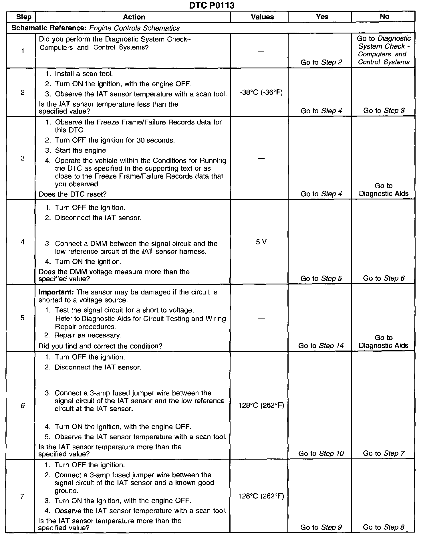 The intake air temperature (IAT) sensor is a variable resistor, sometimes called a thermistor. The IAT sensor has a signal circuit and a low reference circuit. The IAT sensor measures the temperature of the air entering the engine. The powertrain control module (PCM) supplies 5 volts to the IAT signal circuit. When the IAT sensor is cold, the sensor resistance is high. When the air temperature increases, the sensor resistance lowers. With high sensor resistance, the PCM detects a high voltage on the IAT signal circuit. With lower sensor resistance, the PCM detects a lower voltage on the IAT signal circuit. If the PCM detects an excessively high IAT signal voltage, indicating a low temperature, DTC P0113 sets.