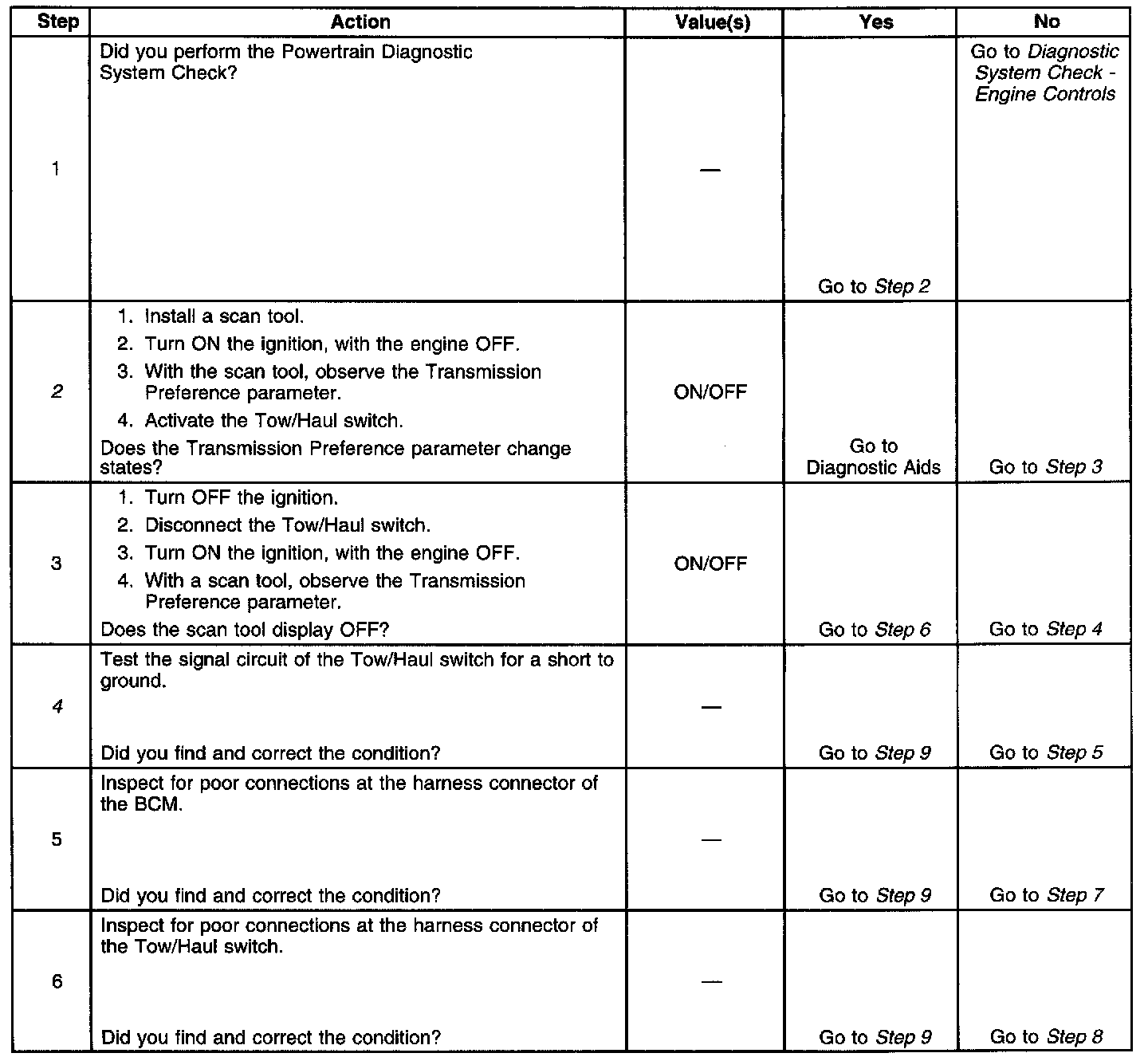 When the signal circuit of the Tow/Haul switch is shorted to ground for approximately 3 minutes.