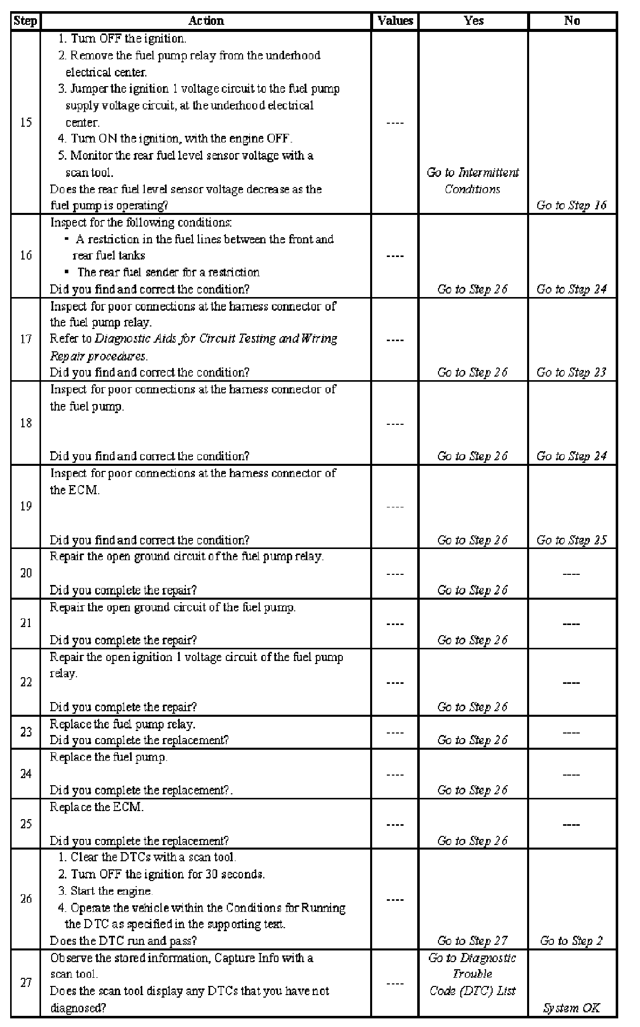 15. This step tests for a fuel flow condition. If the rear fuel level sensor voltage does not decrease as the fuel pump is operating, a restriction in the fuel lines or rear sender is the probable cause of the DTC.