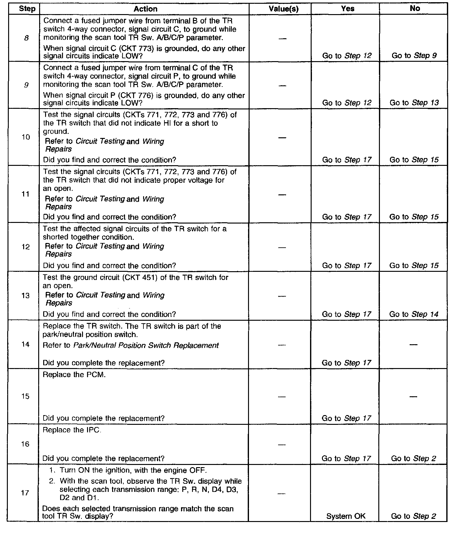 5. This step tests the TR switch wiring for an open or the lack of the signal voltage from the PCM.