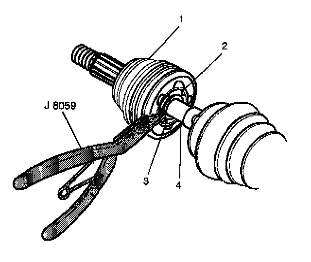 Important: Ensure that the retaining ring side of the CV joint inner race faces the halfshaft bar (1) before installation.