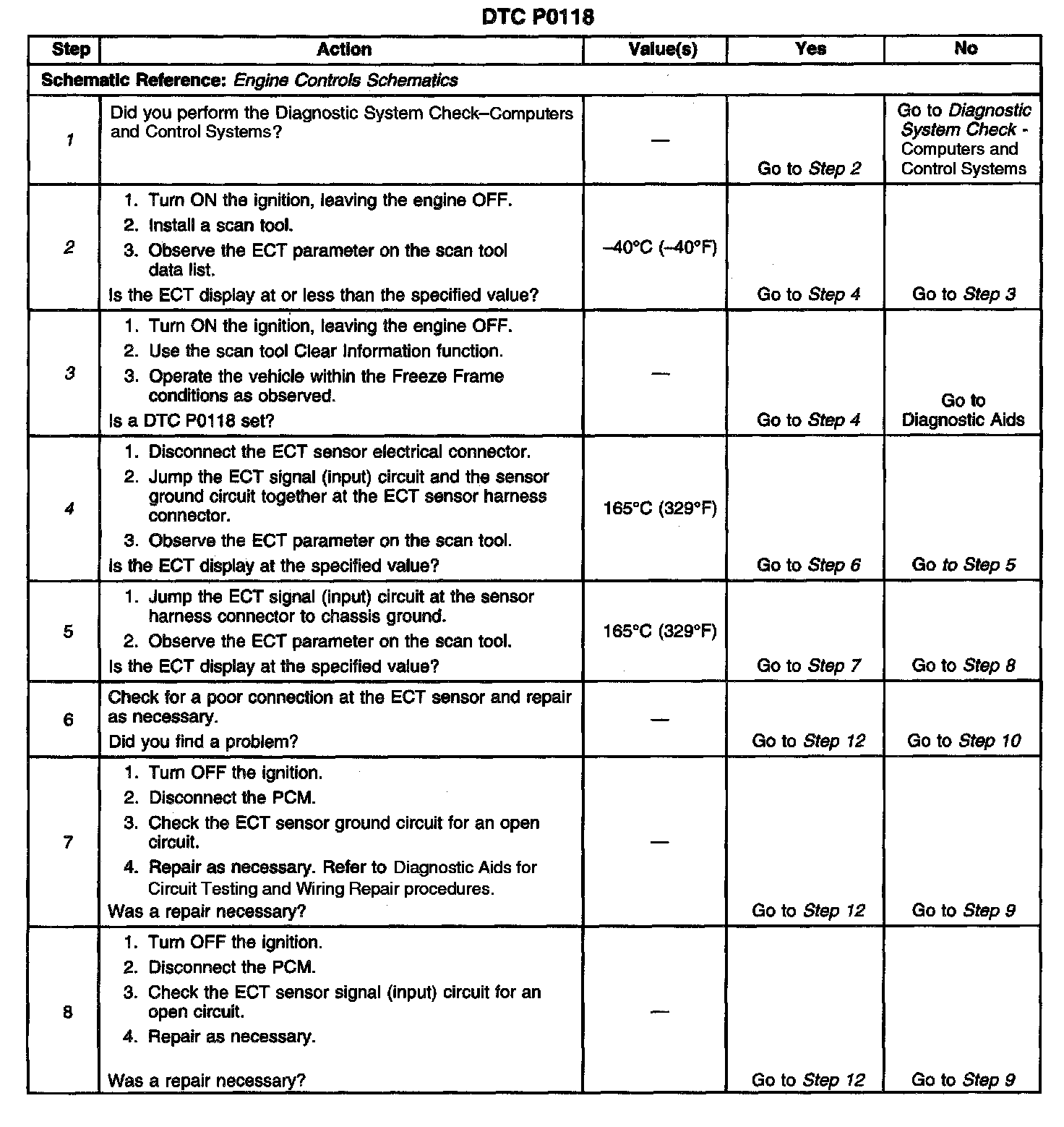 CIRCUIT DESCRIPTIONThe DTC P0118 Engine Coolant Temperature (ECT) Sensor Circuit High Voltage diagnostic monitors the ECT sensor signal. The ECT sensor is a thermistor. A thermistor is a resistor whose value varies with the temperature. The electrical resistance of the ECT sensor is high when the coolant temperature is cold, and the resistance is low when the coolant temperature is warm. The ECT sensor is wired in series with a fixed resistor in the powertrain control module (PCM). The PCM applies 5 volts to the ECT sensor. The PCM monitors the voltage across the ECT sensor and converts the voltage into a temperature reading. The voltage measured by the PCM will be high when the coolant temperature is cold and low when the coolant temperature is warm.