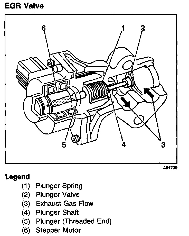 The EGR valve is a stepper motor design. A stepper motor (6) drives a worm gear, that is in mesh with a spring (1) loaded plunger (5). The valve (2) end of the plunger (4) controls the flow of exhaust gases (3). The plunger movement is controlled by the Powertrain Control Module (PCM). By turning the stepper motor in different directions, the PCM controls the opening of the exhaust gas passage to the intake manifold.