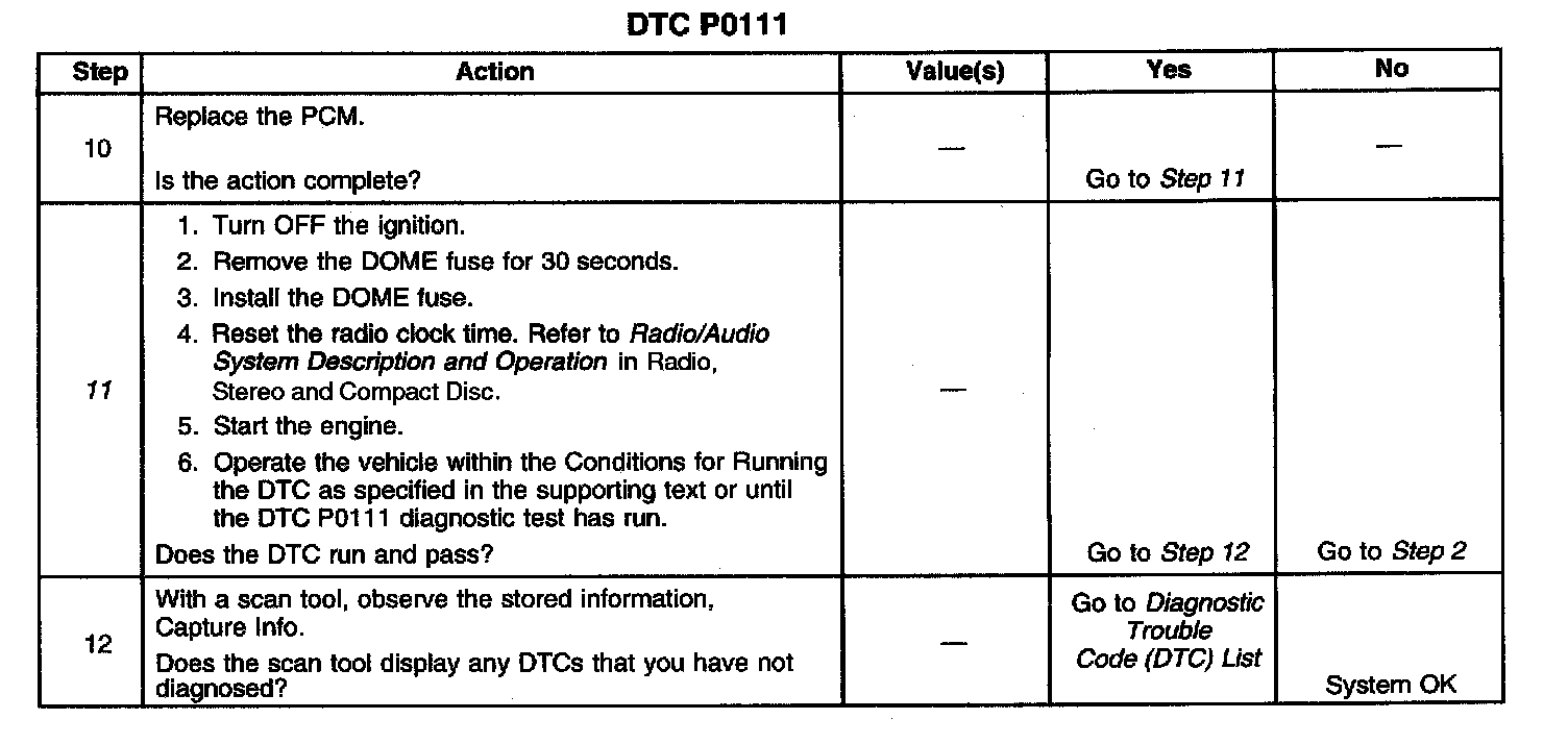 11. Clearing the DTCs by removing the DOME fuse also clears the PCM long term memory. Using the scan tool to clear DTCs leaves the long term memory active. DTC emitting diagnostics may not run to completion as expected unless the long term memory is cleared. Removal of the DOME fuse also clears the time display of the radio. The DTC P0111 diagnostic can be monitored on the scan tool under the Not Ran Since Code Cleared selection in the DTC Information menu. If a DTC P0111 appears in the Not Ran Since Code Cleared list, the DTC P0111 diagnostic has not yet run. When the DTC P0111 does not appear in the Not Ran Since Code Cleared list, the DTC P0111 diagnostic has run. If the MIL is NOT illuminated, and there is no Pending DTC Status in DTC Information, the DTC P0111 diagnostic has passed. The DTCs MUST be cleared in order to view the Current Status of the Not Ran Since Code Cleared list. DO NOT forget that the Not Ran Since Code Cleared list only indicates that the test has run, not whether the test passed or failed. The DTC Information screen must be checked for Current or Pending status, in order to determine the outcome of the diagnostic test involved.