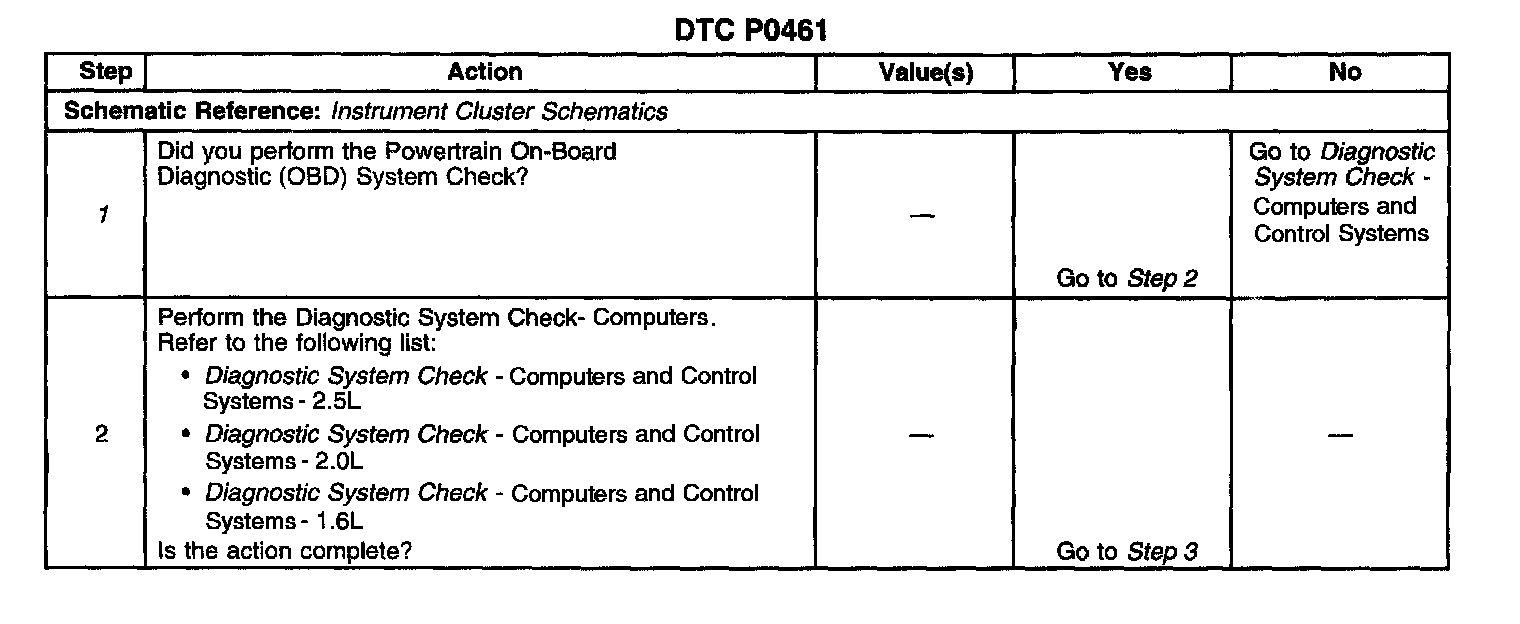 15. This step checks whether the malfunction that caused the DTC P0461 is still present. Driving the vehicle under these conditions will verify whether the fault is present. After performing the scan tool Clear DTC Information function, the DTC P0461 diagnostic can be monitored on the scan tool under the Not Ran Since Code Cleared selection in the DTC Information menu. If DTC P0461 appears in the Not Ran Since Code Cleared list, the P0461 diagnostic has not yet run. When DTC P0461 does not appear in the Not Ran Since Code Cleared list, the P0461 diagnostic has run. If the MIL is NOT illuminated and there is no Pending DTC Status in DTC Information, the P0461 diagnostic has passed. The DTCs MUST be cleared in order to view the Current Status of the Not Ran Since Code Cleared list. DO NOT forget that the Not Ran Since Code Cleared list only indicates that the test has run, not whether the test passed or failed. The DTC Information screen must be checked for Current or Pending status in order to determine the outcome of the diagnostic test involved.