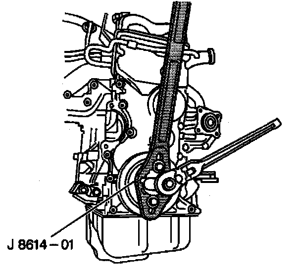 1. Remove the crankshaft pulley retaining bolt using the J 8614-01 to prevent crankshaft rotation when loosening the bolt.