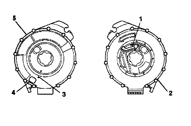 2. If the front (5) of the inflatable restraint steering wheel module coil has a centering window (4), and on the back side (2) a spring service lock (1), perform the following steps: