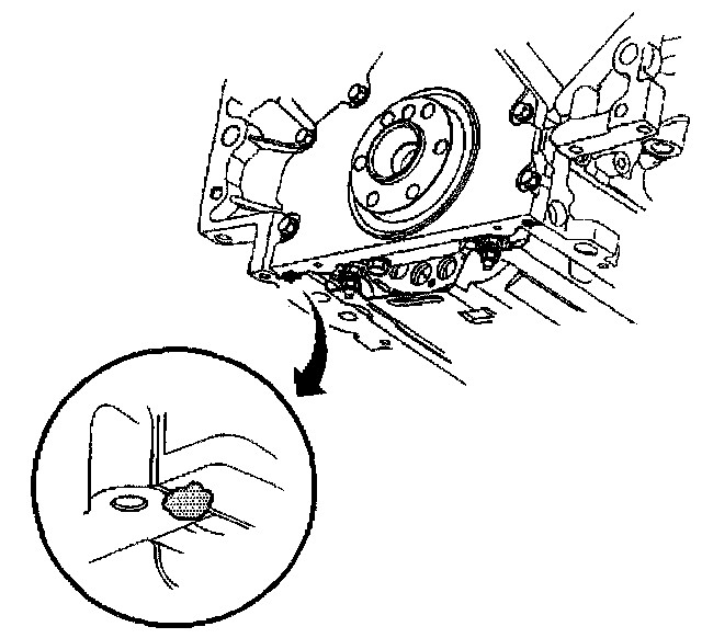 2. Apply a 5 mm (0.20 inch) bead of sealant GM P/N United States 12378190, or equivalent 20 mm (0.8 inch) long to the engine block. Apply the sealant directly onto the tabs of the rear cover gasket that protrudes into the oil pan surface.