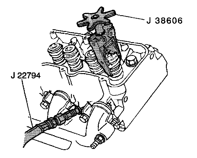 Notice: Completely engage the J 38606 jaws on the valve spring. The J 38606 may slip off and scratch the valve spring. Replace the valve spring if the valve spring becomes scratch.