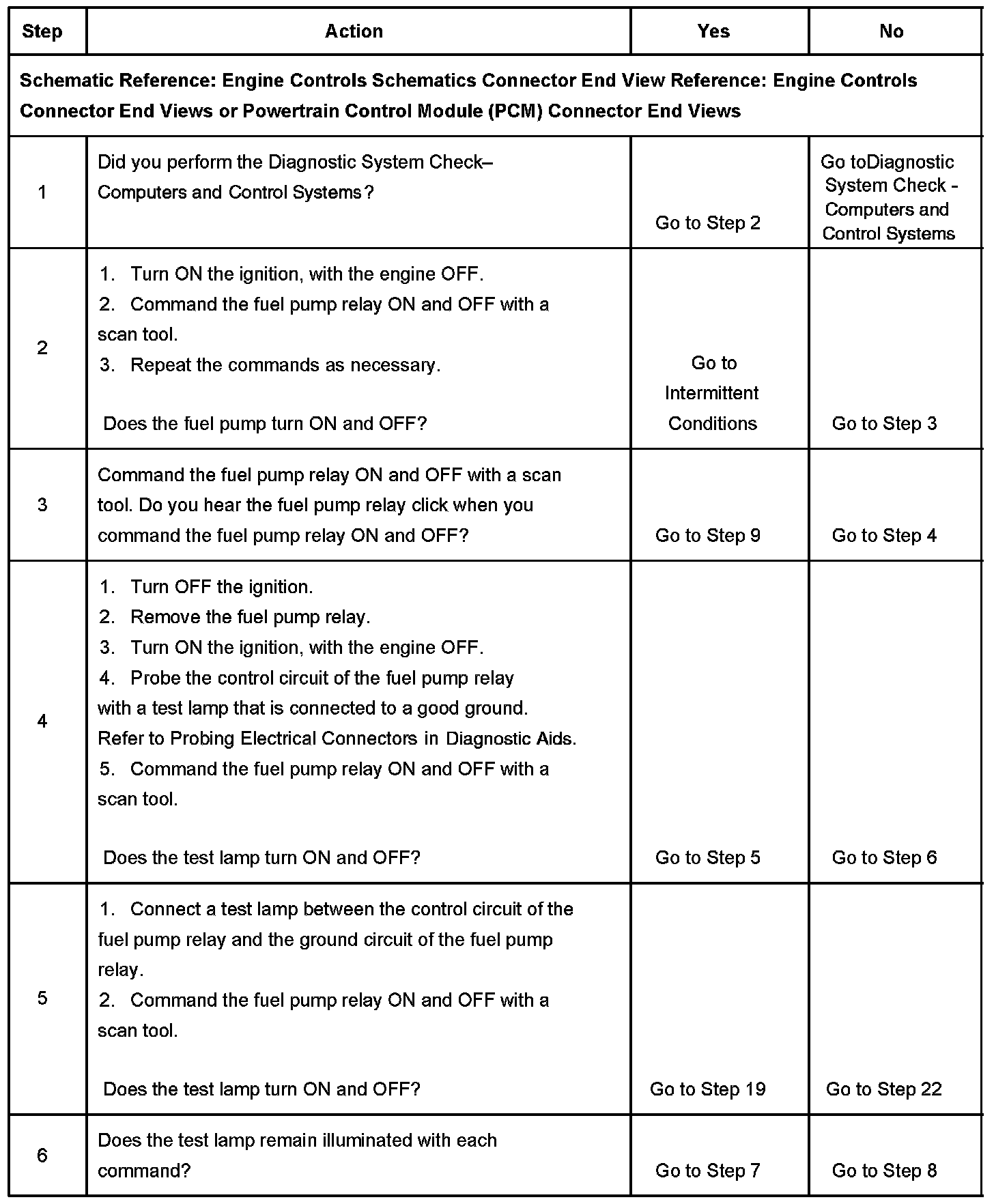 CIRCUIT DESCRIPTIONThe control module enables the fuel pump relay when the ignition switch is turned ON. The control module will disable the fuel pump relay within two seconds unless the control module detects ignition reference pulses. The control module continues to enable the fuel pump relay as long as ignition reference pulses are detected. The control module disables the fuel pump relay within 2 seconds if ignition reference pulses cease to be detected and the ignition remains ON.