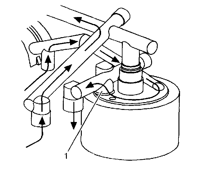 If the oil cooler flow becomes blocked, either from a plugged oil cooler or blocked or kinked oil cooler line, the oil cooler bypass valve (1) is forced open, allowing oil to flow directly into the engine oil passages. Oil does not flow into or out of the engine oil cooler.