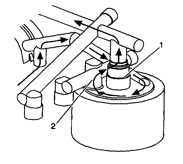 If both the oil filter and the oil cooler are plugged, the pressurized oil is routed around the top of the oil filter, through the oil filter bypass valve (2), through the oil cooler bypass valve (1) and directly into the engine oil passages. Lubrication still occurs, but the oil is not filtered or directed through the oil cooler.