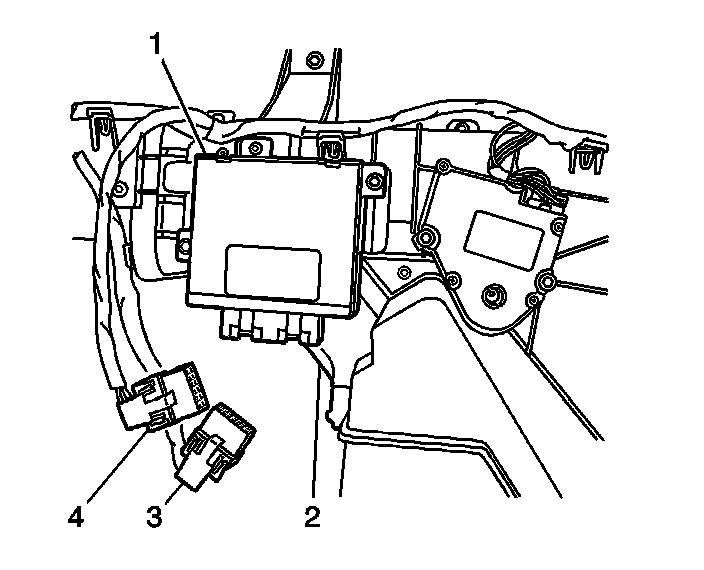2. Disconnect the electrical connectors (3,4) from the auxiliary HVAC control module (1).