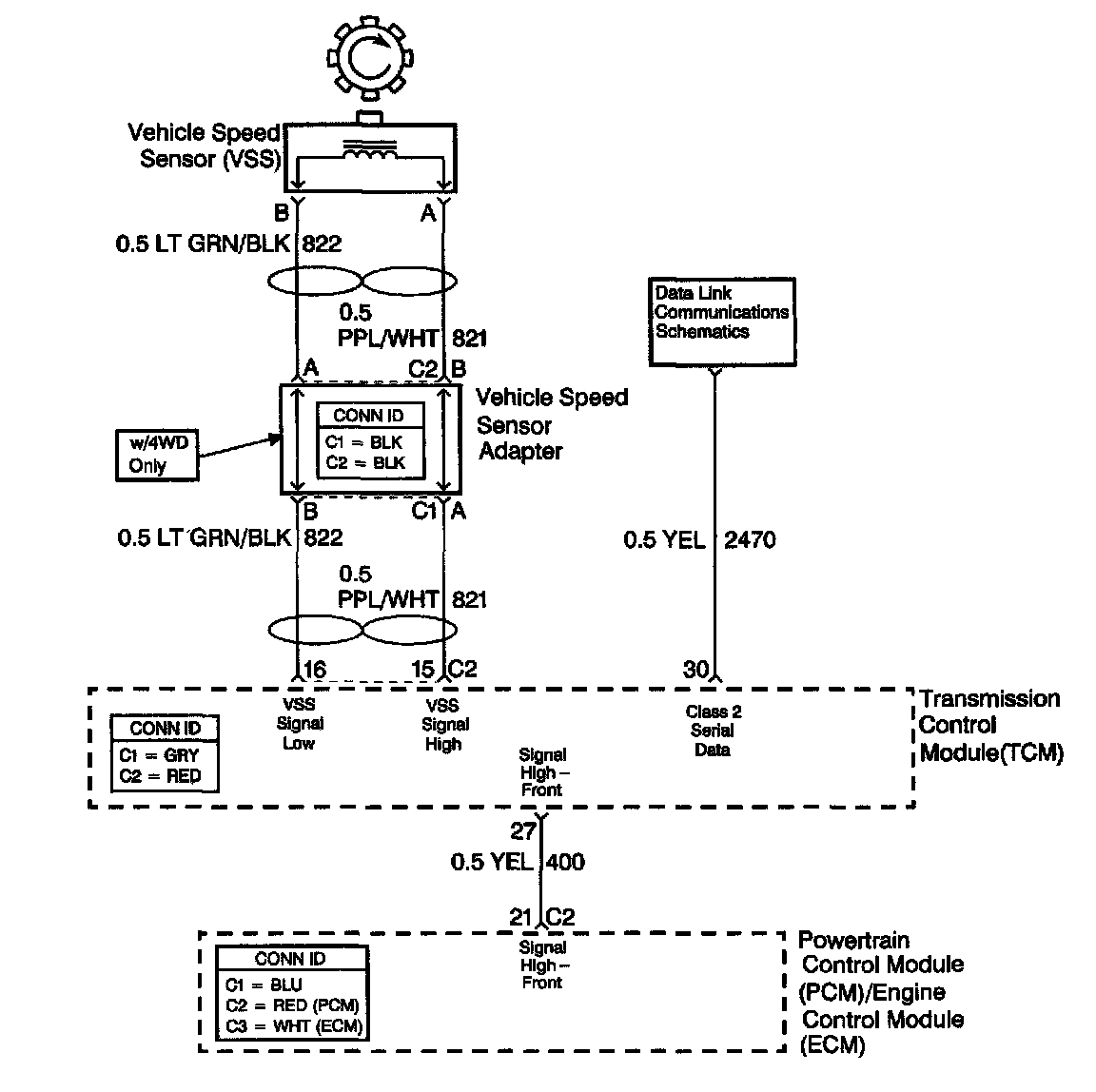 The Vehicle Speed Sensor (VSS) monitors the rotation speed of the transmission output shaft. The VSS assembly is a permanent magnet generator. It produces an AC voltage as the rotor teeth on the output shaft of the transmission, 2WD, or transfer case, 4WD, pass through the sensor's magnetic field. The AC voltage frequency and amplitude increase as the vehicle speed increases. The TCM will send a controlled duty cycle voltage to the Powertrain Control Module (PCM) that operates in a range of -4.5 volts or +5.0 volts. The PCM converts this signal into vehicle speed. As vehicle speed increases, the frequency of the duty cycle will increase. DTC P0500 is a type B DTC.