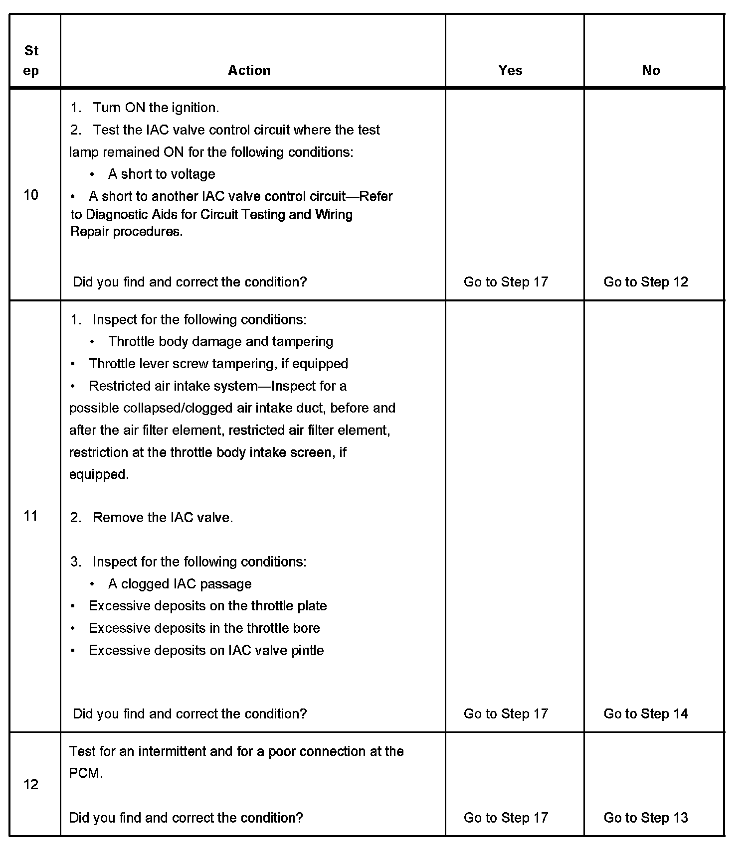 CIRCUIT DESCRIPTIONThe engine idle speed is controlled by the idle air control (IAC) valve. The IAC valve is on the throttle body. The IAC valve pintle moves in and out of an idle air passage bore to control air flow around the throttle plate. The IAC valve consists of a movable pintle, driven by a gear attached to an electric motor called a stepper motor. The stepper motor is capable of highly accurate rotation, or of movement, called steps. The stepper motor has 2 separate windings that are called coils. Each coil is supplied current by two circuits from the powertrain control module (PCM). When the PCM changes polarity of a coil, the stepper motor moves one step. The PCM uses a predetermined number of counts to determine the IAC pintle position. Observe IAC counts with a scan tool. The IAC counts will increment up or down as the PCM attempts to change the IAC valve pintle position. An IAC Reset will occur when the ignition key is turned OFF. First, the PCM will seat the IAC pintle in the idle air passage bore. Second, the PCM will retract the pintle a predetermined number of counts to allow for efficient engine start-up. If the engine idle speed is out of range for a calibrated period of time, an idle speed diagnostic trouble code (DTC) sets.