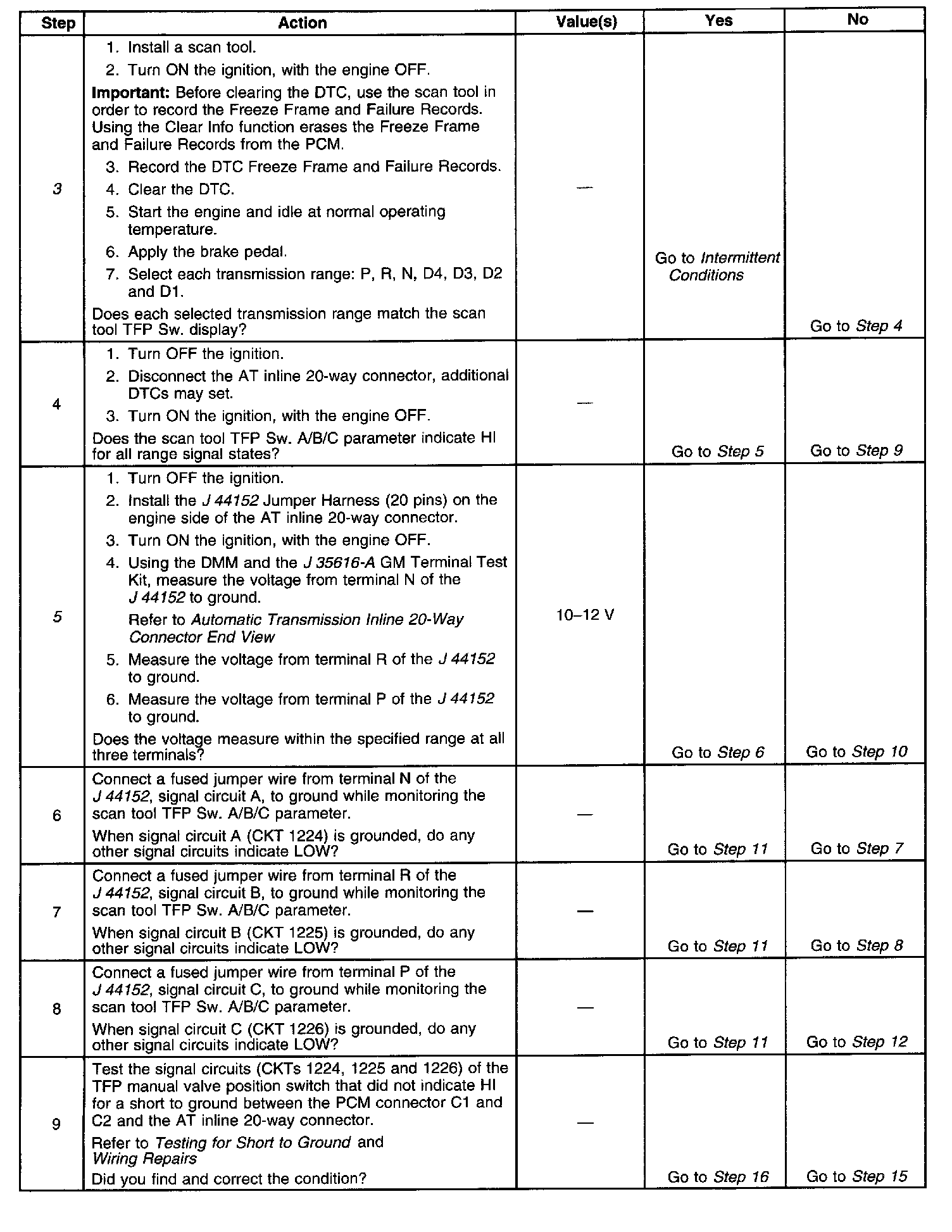 ^ Refer to the Transmission Fluid Pressure (TFP) Manual Valve Position Switch Logic table for the normal range signals and the invalid combinations. On the table, LOW is 0 volts, HI is ignition voltage.