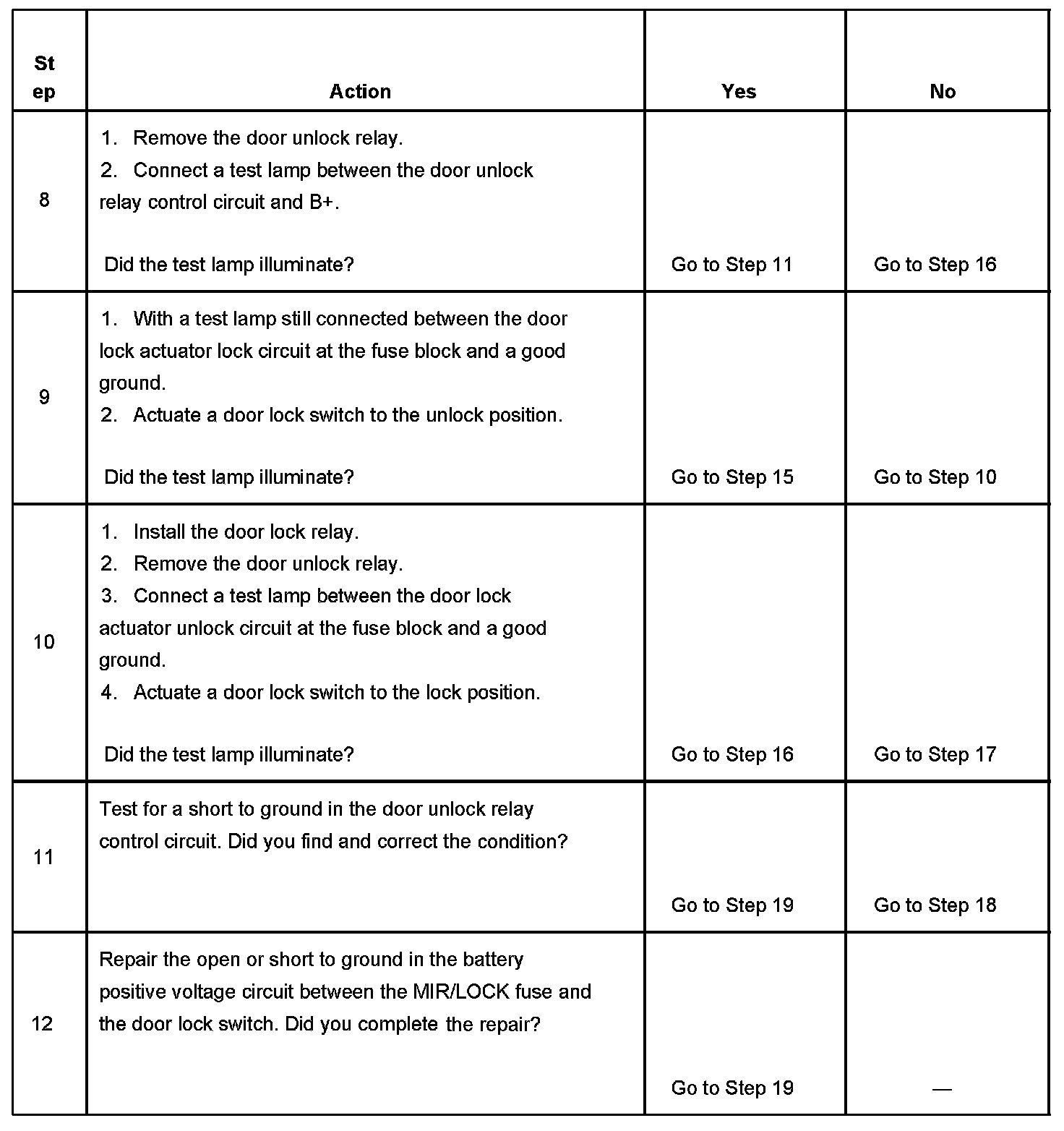 12. The MIR/LOCK fuse supplies battery positive voltage for the power mirrors, power door lock switches and the memory seat switch, if equipped. If the MIR/LOCK fuse is open, all systems on the fuse would be inoperative. The fault could be a short to ground in the battery positive voltage circuit, however, a short to ground in the power mirror motor control or the memory seat control circuits could also be the cause if the fuse opens after any of the switches are activated. If a short to ground exists in either the door lock or unlock relay control circuits, a DTC B3137 or B3147 would set when the BCM commands a lock or unlock function.
