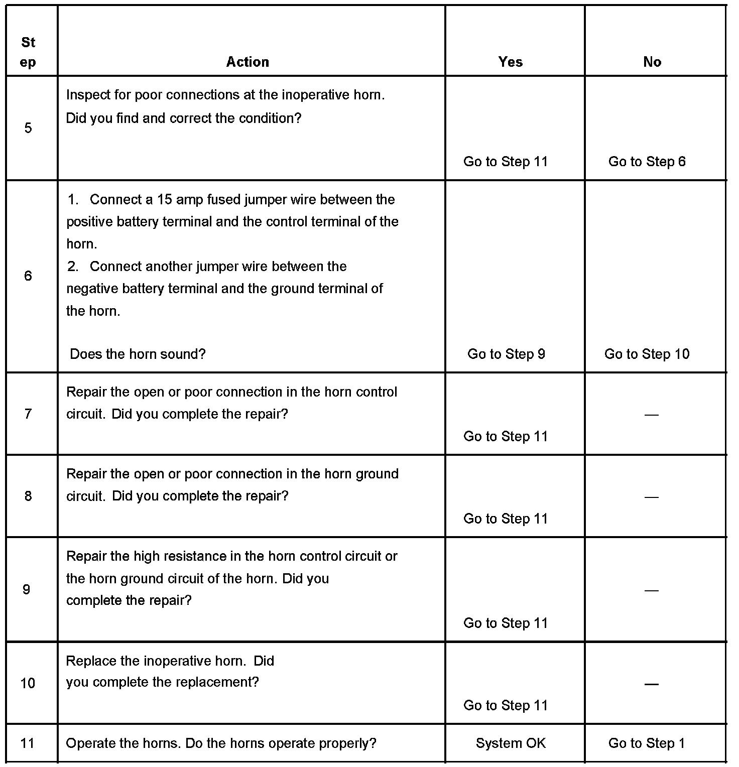 9. The horns need maximum current flow to operate properly. A high resistance, greater than 0.5 ohms, in the horn control circuit or the horn ground circuit could cause operating problems with the horns. Inspect the circuits for faults that would restrict current flow.