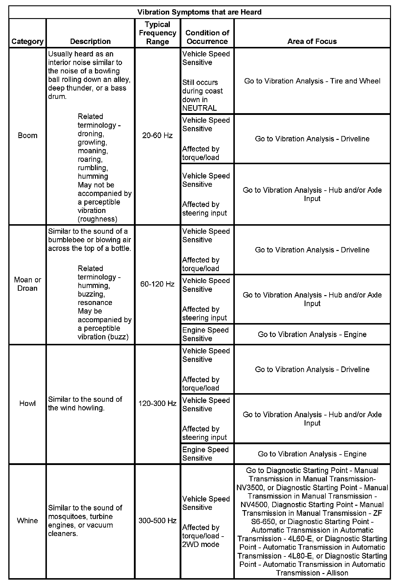 Refer to a Vibration Analysis table as indicated in the following symptom tables, based on the most dominant characteristic(s) of the customer's vibration concern (felt or heard) that is evident during the appropriate condition of the occurrence.