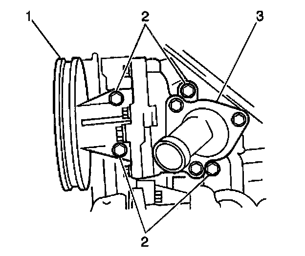 9. Remove the 4 bolts (2) and the water pump from the vehicle.