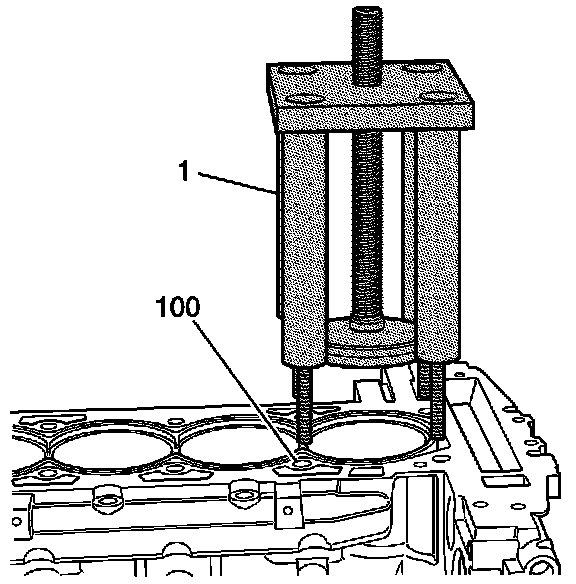 11. Remove the fixture EN 45680-401/cylinder bore sleeve installer EN 45680-403 assembly (1) from the cylinder block (100).