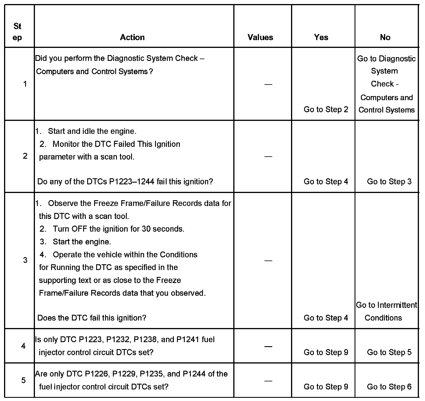 The engine control module (ECM) enables the appropriate fuel injector on the compression stroke for each cylinder. The ECM controls the fuel injection control module (FICM) by grounding the control circuit via a solid state device called a driver. The ECM monitors the state of the driver. If the ECM detects an incorrect voltage for the commanded state of an injector driver, DTCs P1223, P1226, P1229, P1232, P1235, P1238, P1241, or P1244 will set.
