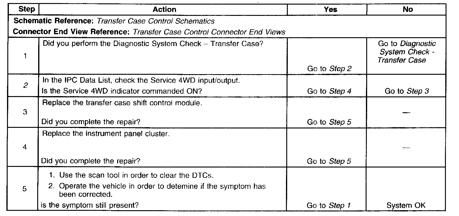 The Service 4WD indicator is located in the instrument panel cluster (IPC), and shares the common power and ground of the IPC. The transfer case shift control module controls the Service indicator lamp by sending the IPC a Class 2 message. This lamp may be controlled with the scan tool using the IPC device controls.