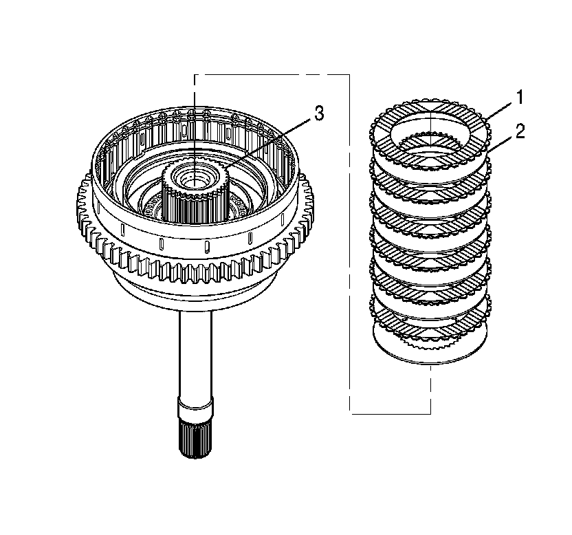 14. Remove six 1-2-3-4 clutch fiber plates (1) and six 1-2-3-4 clutch steel plates (2) from the turbine shaft (3).