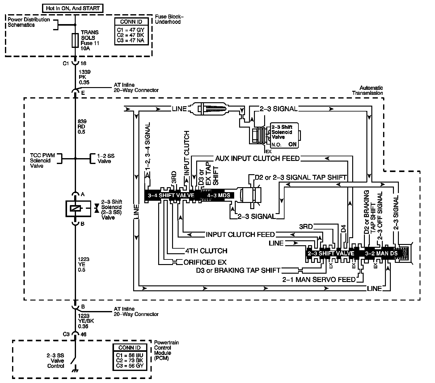 The 2-3 shift solenoid (2-3 SS) valve is supplied with fused ignition voltage. The ground path is controlled by the PCM. When the PCM commands the solenoid OFF, a ground path is not provided and the filtered line pressure that is fed to the solenoid is exhausted. When the PCM commands the solenoid ON, a ground path is provided and the exhaust port is blocked, stopping the exhaust of line pressure.